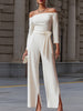 Mooyius introduces an elegant off-shoulder jumpsuit that merges minimalist sophistication with modern eveningwear appeal. This refined piece features a clean neckline that gracefully drapes across the shoulders, offering a feminine and elongated silhouette.