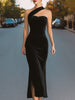 The fitted waist transitions into a long, column-style skirt featuring a discreet side slit, offering ease of movement while maintaining a polished, statuesque line. Each contour of the dress is thoughtfully shaped to highlight feminine elegance while offering a confident, elevated presence suitable for any formal setting.