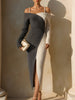 Mooyius presents a striking ribbed knit midi dress that merges sculptural asymmetry with modern feminine elegance. This design features an off-shoulder neckline that drapes effortlessly across the collarbone, supported by delicate pearl-accented straps for a refined touch. The colorblock composition is artfully arranged in a diagonal formation, creating a visually elongating effect that enhances the silhouette. One long sleeve and one sleeveless side introduce an unexpected, fashion-forward balance, while the front slit adds graceful movement and subtle allure.
