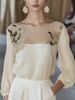 This beige shirt combines timeless elegance with a modern twist. The transparent mesh neckline creates a sophisticated and alluring look, while the floral embroidery adds a touch of romantic detail. Its clean design ensures versatility, making it an ideal choice for both professional and casual settings.The shirt strikes a balance between understated charm and eye-catching detail. Its tailored fit and high-quality materials ensure both comfort and durability.