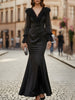 Mooyius presents an elegant mermaid evening dress designed with dramatic sophistication and refined feminine detail. This black gown features a deep V-neckline framed with layered ruffle accents, sheer long sleeves finished with flared ruffle cuffs, and a wrap-style bodice that defines the waist with clean, sculpted lines. The skirt flows into a graceful mermaid hem, creating a striking, elongated silhouette.