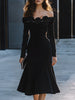 Mooyius presents a captivating black midi dress designed with romantic elegance and modern structure. This off-shoulder dress features a row of luxurious black floral embellishments across the neckline, adding dramatic sophistication. The tailored bodice hugs the figure, while the gently flared skirt creates fluid movement, offering a timeless yet contemporary silhouette.