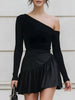 Elevate your allure with this Black One-Shoulder Ribbed Knit Ruffle Hem Mini Dress. Crafted from a combination of ribbed knit and sleek fabric, it features a striking one-shoulder design, long ribbed sleeves, and an asymmetric ruffle hem that adds a dynamic, playful touch.