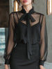Mooyius presents an elevated black sheer blouse designed for the modern woman who values sophistication with subtle sensuality. Crafted with a soft, lightweight, semi-transparent surface, the blouse creates an effortless interplay between coverage and delicacy. The neckline features a refined bow-tie detail that drapes with graceful fluidity, emphasizing the piece’s elegant, elongated proportions. Gently gathered sleeves taper into structured cuffs, adding dimension and polished finish to the silhouette.