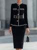 Embrace unparalleled elegance with this Black Velvet Contrast Trim Peplum Jacket & Pencil Skirt Set. Crafted from luxurious velvet fabric, the set features a chic peplum jacket with white contrast piping, gold-tone buttons, and a statement belt to cinch the waist, paired with a sleek pencil skirt that offers a polished silhouette.
