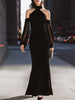 Ideal for commanding attention at the most elegant occasions, this gown ensures you look opulent and sophisticated. The black velvet exudes luxury, while the mesh sleeves and off-shoulder style infuse modern glamour. Pair it with a sparkling clutch and stiletto heels for a look that transitions seamlessly from cocktail hours to late-night celebrations, guaranteeing you stand out in every setting.