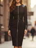Mooyius unveils the Black Zip-Front Bodycon Dress — a statement of modern sophistication and refined edge. This sleek design captures the balance between classic femininity and contemporary confidence, featuring a central zipper closure that elongates the silhouette while introducing a touch of urban polish. Subtle leather-look panels accentuate the shoulders, waist, and cuffs, creating a strong, structured profile that empowers every movement.