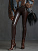 These chocolate brown faux leather leggings are the perfect blend of style and comfort, offering a modern edge with their sleek design. The glossy finish adds a touch of sophistication, making them versatile for both casual and dressier occasions.