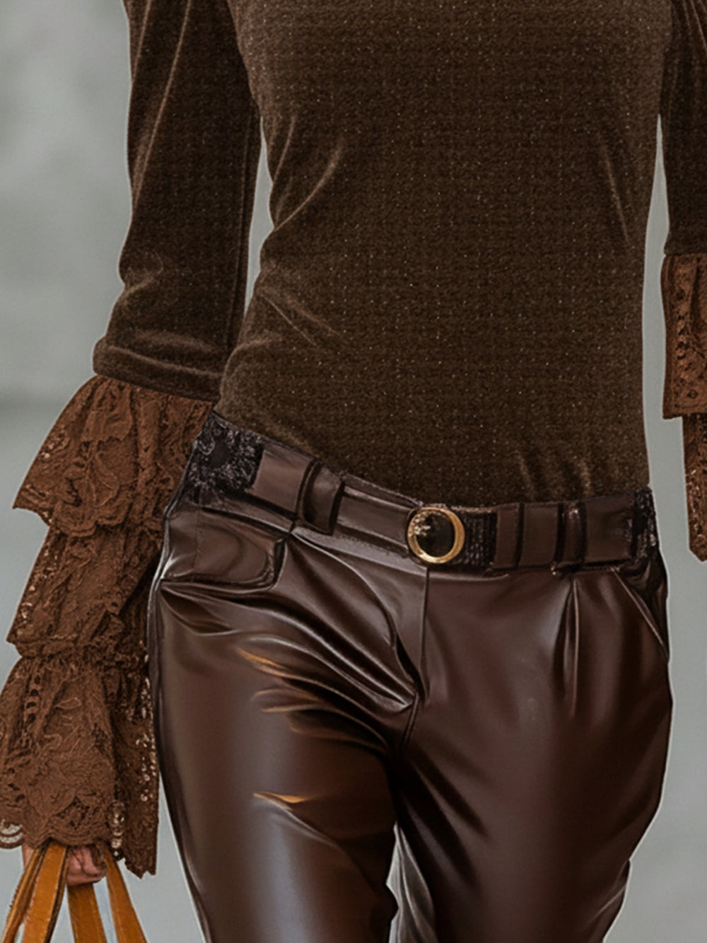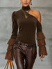 Elegant yet striking, this chocolate brown velvet top fuses modern chic with timeless sensuality. The asymmetric one-shoulder silhouette and high neckline exude confidence, while cascading lace sleeves bring depth and softness to the design. The rich brown tone complements both casual and dressy ensembles.