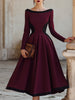 Mooyius presents a striking burgundy A-line dress with sophisticated black color-block accents. The dress features a classic boat neckline and long sleeves, beautifully contrasted with black panels along the sides for a slimming effect. The voluminous skirt adds a dramatic flair, while the flattering fit-and-flare silhouette enhances the feminine shape.
