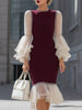 Sophistication meets romantic artistry in this Mooyius burgundy dress, an exquisite statement for refined evenings. Crafted with precision, it features sheer layered bell sleeves trimmed with delicate gold-edged ruffles and pearl embellishments that cascade with movement. The fitted bodice and ruffled hemline balance structure and fluidity, creating an elegant hourglass silhouette.
