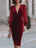 Mooyius presents the burgundy midi dress is designed to exude luxury and charm. Featuring a dramatic deep V-neckline, sheer organza puff sleeves, and a figure-hugging silhouette, it accentuates feminine curves with opulent grace. The velvet fabric adds a rich texture, while the tailored fit creates a timeless yet glamorous look.