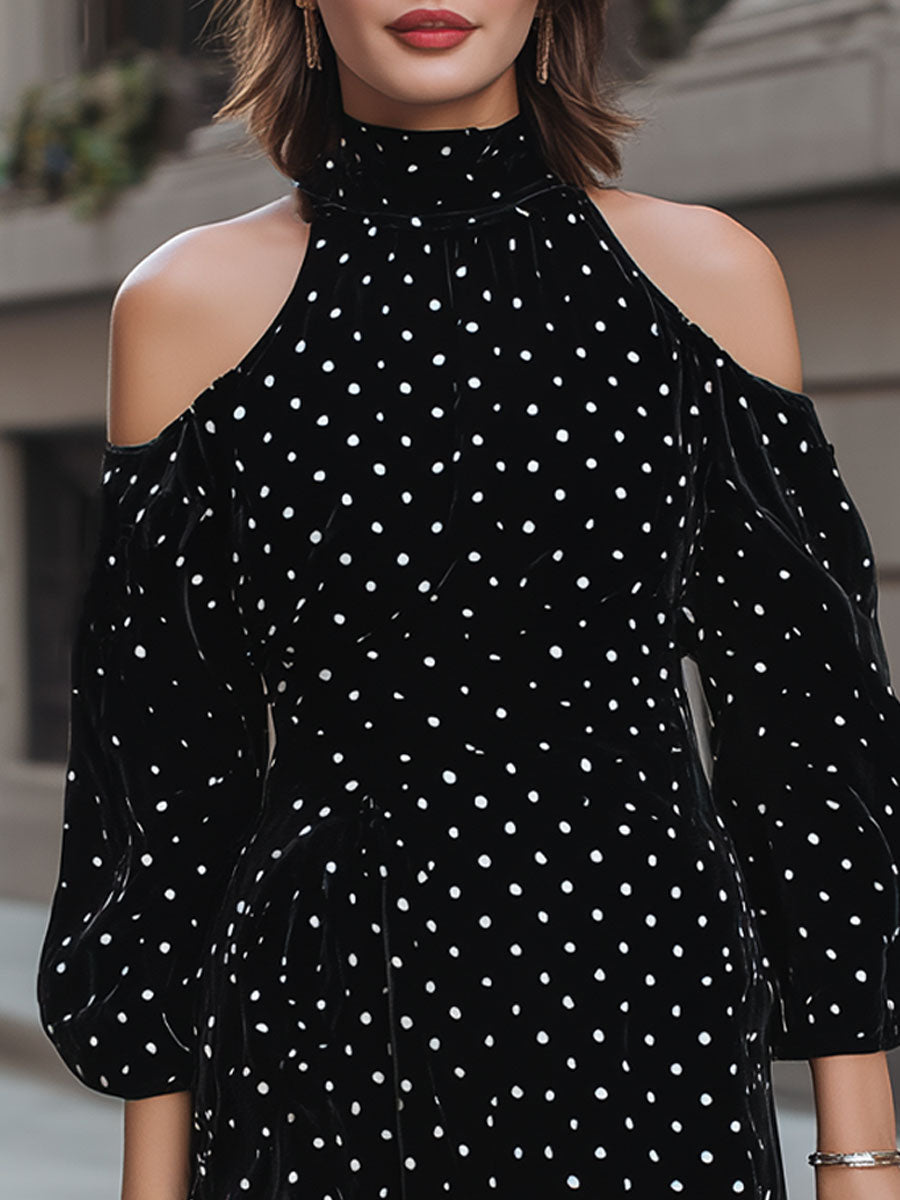 Perfect for cocktail parties or evening gatherings, this dress ensures you stand out with timeless charm. The velvet fabric offers a sumptuous feel and rich texture, while the polka dot print and cold-shoulder details add playful yet sophisticated touches. Style it with metallic accessories and a structured clutch for a polished, confident look that transitions seamlessly from day to night.