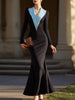 Mooyius presents a refined mermaid gown designed to capture timeless elegance with a sleek, modern edge. This full-length silhouette features a sharply contoured contrast V-panel that frames the neckline and elongates the torso, creating a striking architectural focal point. The long fitted sleeves and clean, sculpted bodice emphasize the natural curves, while the flared mermaid hem adds graceful movement. Subtle shoulder gathers enhance the structured yet feminine shape, making this gown an exceptional choice for elevated occasions.