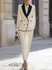 Perfect for making a powerful statement in any professional or formal occasion, this suit set ensures you look poised and authoritative. The cream hue with black trims offers a fresh take on traditional styling, while the premium fabric guarantees comfort and a flawless fit. Style it with a crisp button-down shirt and metallic heels for a look that transitions seamlessly from the boardroom to evening events.