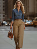 Mooyius reimagines casual sophistication with this effortlessly polished ensemble. The denim button-up shirt, rendered in a soft indigo wash, offers timeless appeal with its structured silhouette, chest pockets, and tailored fit. Paired with high-waist khaki trousers, the look captures the essence of urban utility and modern femininity — ideal for women who value ease and refinement in equal measure.