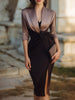 Expertly crafted to highlight graceful draping and polished evening structure, this dress captures refined glamour with modern precision. The contrast lapel adds a distinguished focal point, while the wrapped waist creates a naturally sculpted line that enhances the figure. The front slit introduces fluid movement and sophistication, making it a standout choice for occasions where elegance is essential. Designed for women who appreciate timeless style elevated with contemporary detailing, this piece delivers confidence, poise, and lasting impression.