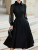 Mooyius presents a refined midi dress that blends structured tailoring with graceful fluidity. This design features a crisp collared neckline, a clean front placket, and semi-sheer long sleeves that introduce a delicate contrast to the otherwise sculpted silhouette. The fitted bodice transitions into a full A-line skirt, offering volume and movement while maintaining a polished, sophisticated profile.