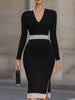 Mooyius presents the Elegant Black Rib-Knit Lace-Trimmed Deep V-Neck Sheath Midi Dress, designed for the woman who values a blend of comfort and refined style. This dress features a deep V-neckline, rib-knit fabric for a figure-hugging fit, and delicate white lace trims at the waist and hem, adding a touch of feminine elegance. The midi length with a subtle side slit offers a perfect balance of classic charm and modern allure.