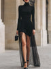 Mooyius presents the Elegant Black Turtleneck Mesh Asymmetrical Maxi Dress is designed for the modern woman who craves dramatic elegance. The dress features a form-fitting turtleneck bodysuit paired with an asymmetrical skirt that blends a sleek mini silhouette with a flowing mesh overlay, effortlessly merging sophistication with bold allure.