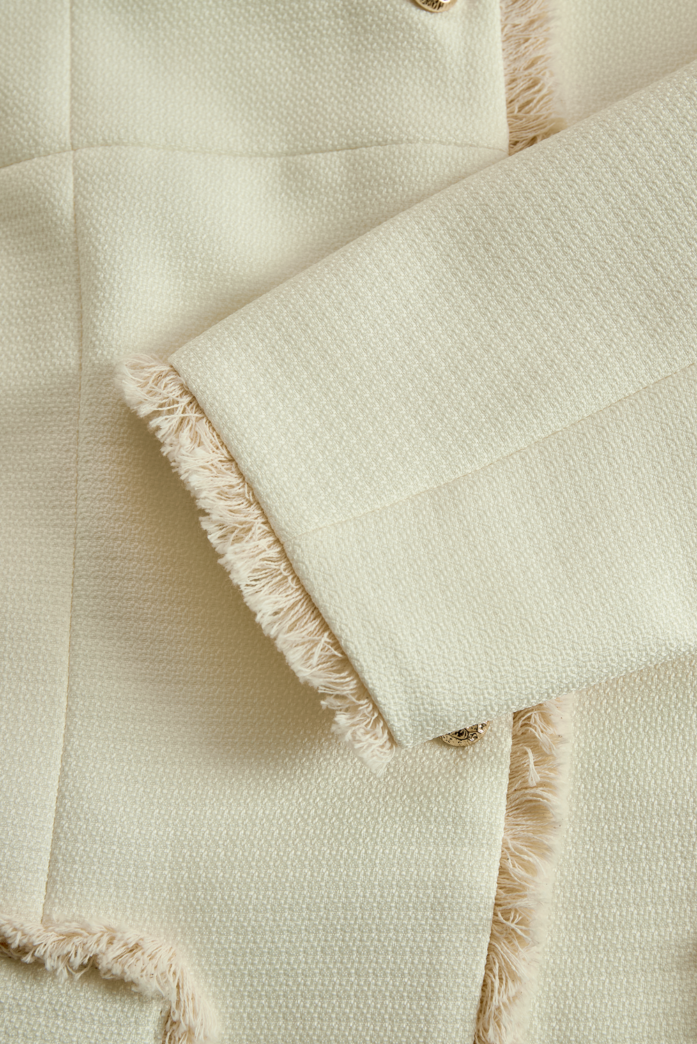 Mooyius presents the cream textured blazer, designed for the modern woman who appreciates elegance and detail. The tailored silhouette flatters every figure, while the unique fringe trim adds a touch of chic personality. Finished with classic gold-tone buttons and functional front pockets, this blazer is perfect for elevating your workwear or adding refinement to your everyday look.
