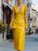 This striking yellow faux leather midi dress commands attention with its seamless fusion of bold modern design and feminine allure. Featuring a deep V-neckline balanced by intricate lace long sleeves, the silhouette exudes refined confidence. The body-sculpting cut highlights the figure, while the midi length maintains a polished, sophisticated presence.