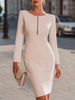 This refined long-sleeve bodycon dress is designed for the modern woman who seeks sophistication with a contemporary twist. Featuring a clean, sculpted silhouette, the dress highlights the natural curves while maintaining an elegant and polished presence. The subtle front zip detail adds a touch of modern minimalism, creating a focal point that elevates the look without overpowering its simplicity.