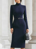 Mooyius presents the Elegant Navy Turtleneck Sheath Midi Dress, crafted for the modern woman who desires a fusion of sophistication and professional elegance. The dress features a chic turtleneck, long sleeves, and a tailored sheath silhouette that sculpts the figure. Made from premium structured fabric, it offers a polished look with a comfortable fit. A sleek belted waist accentuates the silhouette, while the midi length ensures versatility for various formal and professional settings.