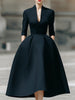 A modern take on timeless sophistication, this black midi dress epitomizes quiet luxury and refined tailoring. Crafted from premium structured fabric, it showcases a minimalist yet striking silhouette that emphasizes feminine strength and grace. The deep V-neckline and three-quarter sleeves create an elegant frame, while the voluminous A-line skirt adds architectural balance.