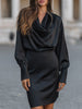Timeless elegance meets contemporary sophistication in this black satin draped dress. Crafted from a luxuriously smooth fabric, it features a fluid cowl neckline that frames the collarbone with understated sensuality. The soft sheen of the satin catches light beautifully, creating a graceful flow with every movement.