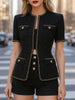 Elevate your street-to-soirée look with this luxe black tweed set, composed of a structured short-sleeve jacket and coordinating high-waisted shorts.