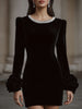A study in modern opulence, this black velvet mini dress epitomizes understated glamour and refined craftsmanship. The luxurious velvet fabric drapes beautifully over the figure, enhanced by the soft sheen that catches the light subtly.