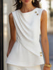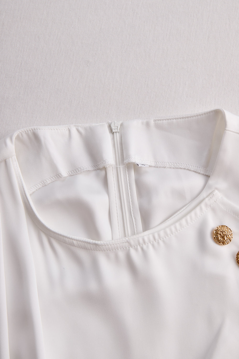 Mooyius presents the Elegant White Draped Top with Button Detail to elevate your sophisticated look. Step into sophistication with our elegant white draped top, featuring unique button detailing for added flair. Crafted from high-quality fabric, this top offers a chic silhouette that flatters every body type. The draped design provides an effortlessly stylish look, perfect for both professional and casual settings.