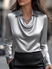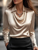 Mooyius presents the Elegant White Satin Blouse with Draped Neckline to elevate your sophisticated look. This white satin blouse features an elegant draped neckline, exuding sophistication and making it perfect for both professional and evening wear.