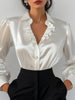 Mooyius presents the Elegant White Satin Blouse with Ruffled V-Neckline to elevate your sophisticated look. This luxurious white satin blouse boasts a ruffled V-neckline for a touch of femininity and sophistication. Featuring long puffed sleeves with buttoned cuffs and a tailored fit, it seamlessly blends elegance and modernity.