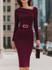 Mooyius presents the elegant wine red midi dress, featuring a sophisticated pencil silhouette and a unique asymmetrical neckline. The tailored fit is enhanced by a matching belt with a chic metallic buckle, beautifully accentuating your waist and creating a strikingly feminine profile. Crafted from high-quality fabric, this dress offers both comfort and a smooth, flattering finish.