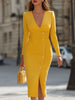 Mooyius presents the Elegant Yellow Deep V-Neck Button-Front Sheath Midi Dress, crafted for the modern woman who exudes confidence and grace. This dress features a striking deep V-neckline, structured shoulders, and eye-catching gold-tone buttons that add a touch of opulence. The body-con silhouette and midi length with a subtle slit offer a perfect blend of classic elegance and contemporary charm.
