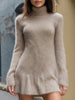 The high turtleneck design not only enhances warmth but also elongates the neckline for a graceful profile. Long sleeves extend into a soft, slightly flared finish, complementing the playful hemline that adds subtle movement to the mini length.Perfect for brisk city strolls, intimate gatherings, or casual-chic evenings, this piece is crafted for the modern woman who values comfort without compromising sophistication.