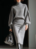 Crafted with modern minimalism in mind, this gray ribbed turtleneck sweater dress delivers both warmth and sophisticated edge. The batwing sleeves lend architectural volume, while the fitted midi skirt adds feminine definition. A versatile cold-season essential, it pairs effortlessly with tall boots and structured outerwear for a polished, contemporary look.