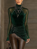 This emerald velvet mesh top exudes modern glamour with its sleek silhouette and artful asymmetry. The draped ruching and button details along the waist create a sculpted effect, while the combination of velvet and mesh brings a perfect balance of elegance and edge. Its rich emerald tone adds depth and mystery, making it a refined choice for evening occasions.