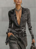 This elegant leopard print T-shirt combines sophistication with a modern feel. The eye-catching deep cowl neck adds charming detail, while the unique print provides a visual highlight. The long sleeved design adds a touch of sophistication and makes it a versatile piece that can easily create both casual and formal looks. Pairing it with high waisted trousers or a fitted leather skirt further accentuates its elegant charm. Adding a few eye catching accessories, such as layered necklaces and statement earrings, will elevate the overall style. Whether attending a fashion party or strolling through the city at night, this top will effortlessly elevate your wardrobe.