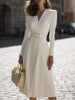 Mooyius presents an impeccably tailored midi dress that captures timeless elegance through clean lines and structured refinement. This ivory design features a sharp V-neckline, long fitted sleeves, and a sculpted bodice that transitions into a graceful A-line skirt. A matching waist belt with a gold-tone buckle adds polished definition and elevates the dress with a touch of modern luxury.