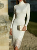 Mooyius presents a refined ribbed knit midi dress that blends sculpted minimalism with delicate feminine detailing. The silhouette features a high turtleneck that frames the neckline with elegant structure, complemented by long fitted sleeves for a sleek, elongating effect. The ribbed texture creates a smooth, body-contouring fit that enhances the natural shape while maintaining sophistication. A softly cinched waist provides subtle definition, transitioning into a streamlined pencil skirt. The hem is finished with intricate lace detailing, adding a romantic touch and a graceful contrast to the clean upper design.
