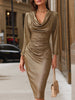 Mooyius presents an elegant metallic midi dress designed to capture light and movement with refined sophistication. This dress features a soft draped neckline that enhances the décolleté with effortless grace, while the long fitted sleeves balance the silhouette with a sleek, polished finish.