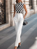 Make a striking impression in this bold black-and-white ensemble. The sleeveless high-neck checkered blouse is a modern nod to retro aesthetics, offering a sleek, graphic appeal. Crafted from a smooth, lightweight fabric, it pairs perfectly with the high-waisted tailored white trousers that deliver a crisp, elongated silhouette.