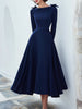 Mooyius introduces the Navy Bow-Shoulder Long-Sleeve Midi Dress — a refined expression of elegance and timeless femininity. Crafted in a deep navy tone that radiates sophistication, this design captures the balance between classic poise and modern grace.