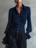 This navy pleated button-up blouse exudes elegance and sophistication through its structured pleats and flowing chiffon fabric. The ruffled cuffs bring movement and grace, balancing the crisp lines of the bodice. The blouse’s design highlights a modern, poised aesthetic suitable for both professional and refined evening looks. Its deep navy tone further enhances its timeless appeal, making it a versatile wardrobe statement.