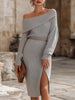 Mooyius presents an elegant ribbed knit midi dress that blends soft sophistication with a modern, feminine silhouette. The off-shoulder neckline drapes gracefully across the collarbone, creating a refined yet relaxed appeal. Long fitted sleeves balance the exposed neckline, while the ribbed texture elongates the figure. A slim metallic-style belt softly defines the waist, complementing the streamlined pencil skirt that features a side slit for ease of movement and subtle allure.