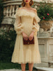 Mooyius presents a romantic tulle midi dress designed with soft volume and timeless femininity. The off-shoulder neckline is adorned with layered ruffles that create a graceful, cloud-like frame around the shoulders and collarbone. Sheer long sleeves introduce delicate transparency, enhanced by soft gathered tiers that add sculptural movement. The fitted bodice transitions into a flowing A-line skirt, complete with a gently ruffled hem for added dimension. The overall silhouette offers a dreamy, ethereal presence perfect for elegant daytime or evening occasions.