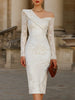 Mooyius presents an elegant jacquard midi dress that blends sculptural asymmetry with refined feminine detailing. The design features a one-shoulder neckline enhanced by a soft, draped fold-over panel that creates a graceful diagonal line across the bodice. Long sheer lace sleeves add delicate contrast to the structured jacquard body, balancing sophistication with subtle romance. The tailored pencil silhouette contours the waist and hips, offering a polished, elongated shape ideal for elevated occasions.